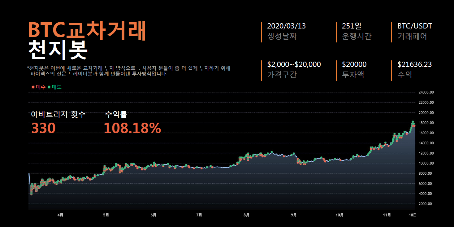 최근 파이넥스 AMA에 따르면 천지봇은 자동으로 저점매수 고점매도 가능, 패닉셀 패닉바잉을 피하고 이성적인 AI의 판단으로 장기적으로 비트코인 수량을 늘려가려는 투자자에게 추천하고 싶은 봇이라고 합니다.