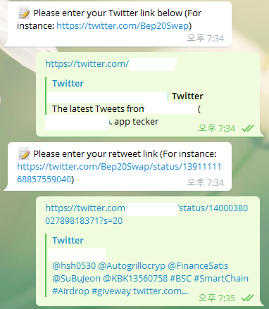3. 트위터 팔로우 & 리트윗 ( 0.07 BEP 20 )