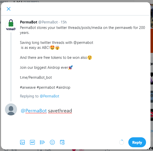 5. 트위터 게시물에 @PermaBot 태그 후 savethread를 작성하고 해당 게시물 주소 업로드