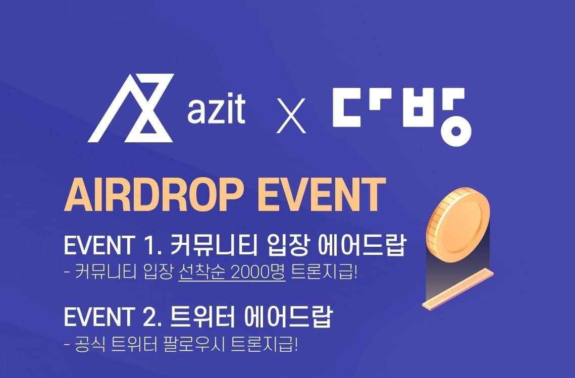 * 블록체인 주거 서비스 플랫폼 AZIT가 부동산 어플 다방과 파트너십 체결 기념으로 이벤트를 진행합니다. 기대하는 프로젝트!