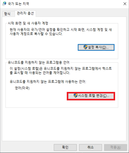현재 시스템 로캘이 영어(미국)으로 되어 있는 것을 한국어(대한민국)으로 수정한다.