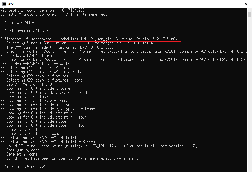 cmake CMakeLists.txt -B json_git -G "Visual Studio 15 2017 Win64" 명령어를 입력해서 프로젝트를 만들어낸다.