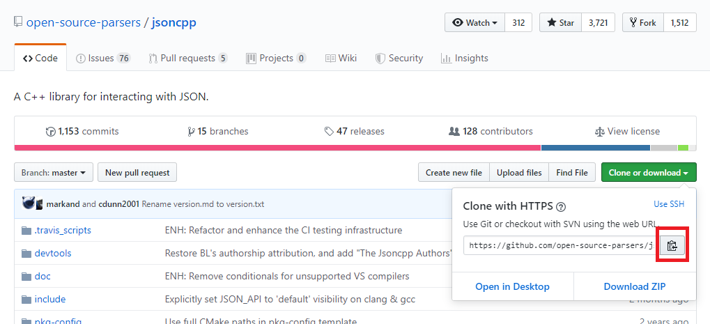 jsoncpp를 사용하기 위해서 우선 위 사이트로 가서 git 주소를 받아온다.